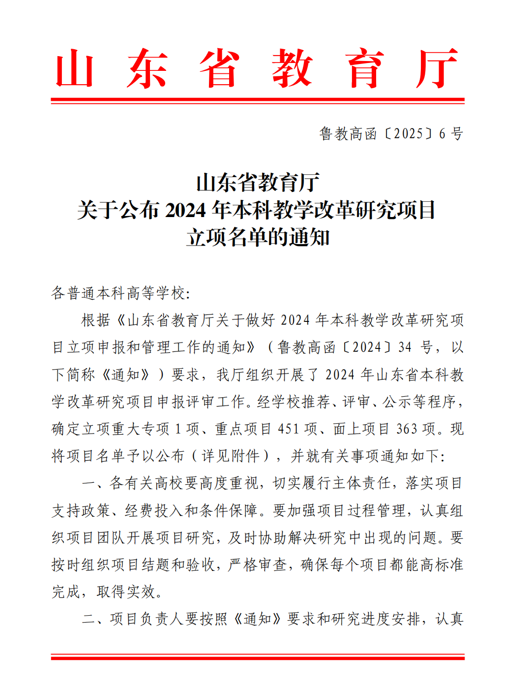近日,山东省教育厅公布了2024年省级本科教学改革研究项目立项名单,我院张蓓教授主持申报的《构建“六位一体”的基础医学国家级实验教学示范中心》获批重点项目,标志着学院在实验教学改革创新领域取得重要突破。