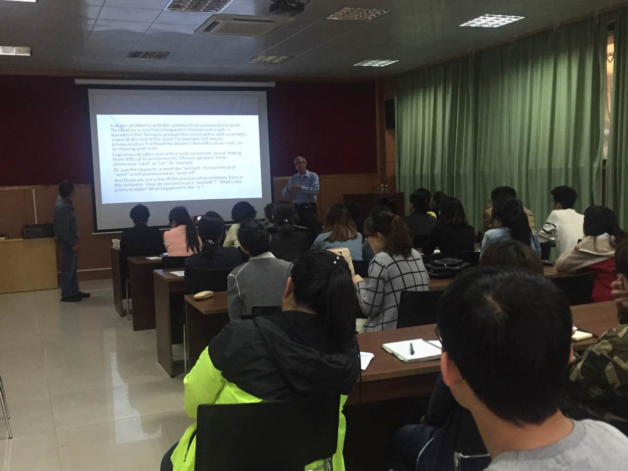 此次学术报告,Bogott博士为我们介绍了中国人在撰写英文论文时最常容易出现的一些小错误。比如:冠词a,an,the的用法,动词的用法,时态的运用等等。看似内容极相似的两种说法,就会给人造成截然不同的理解。报告结束后,多位老师和同学用英文进行提问、交流和讨论,学术氛围良好。