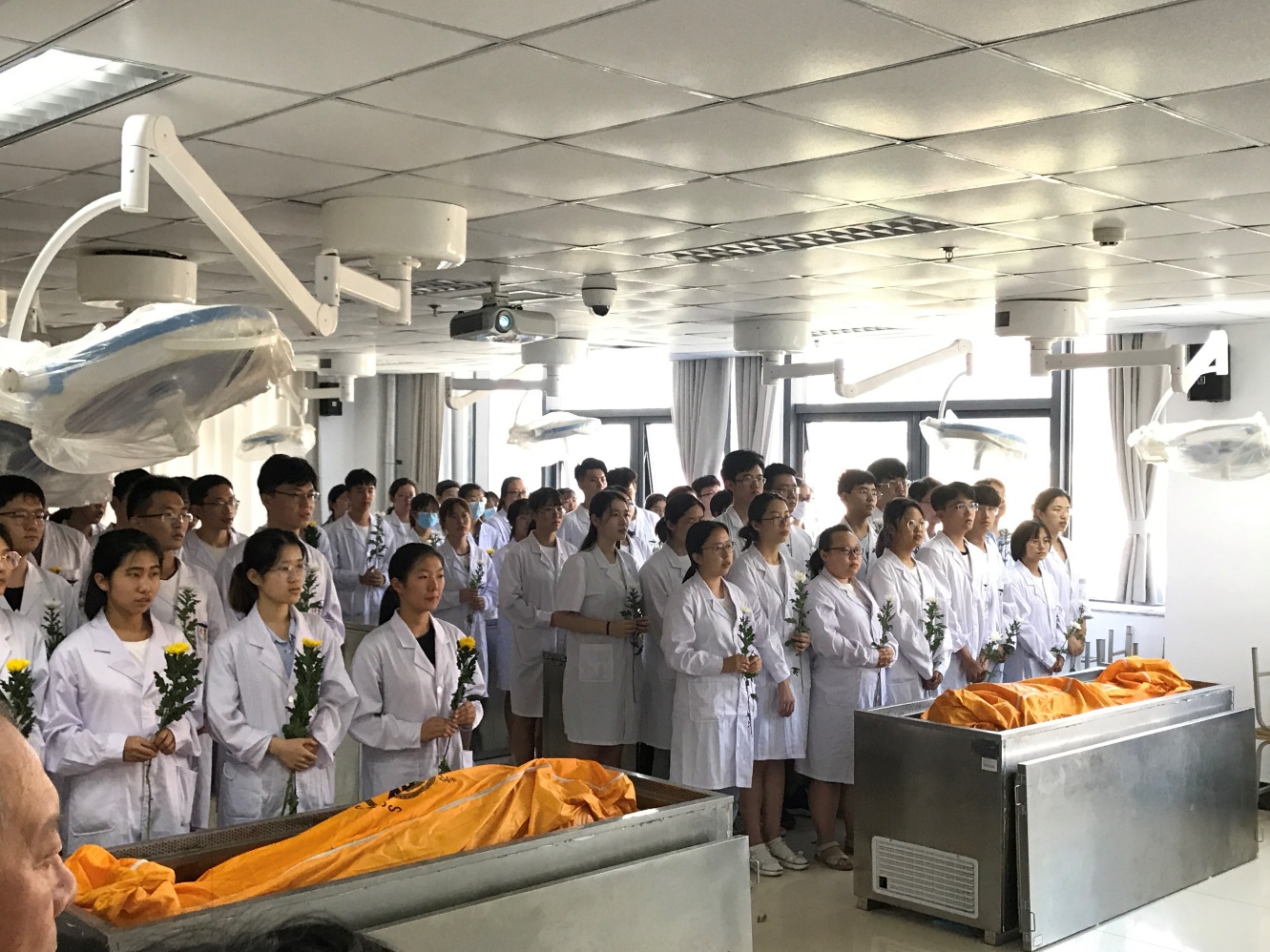同学们手捧黄白菊花,满怀感恩与敬畏之心,肃立在“无言良师”遗体前。“解剖学誓词”宣誓结束后,师生向无言良师献花,全体人员静默1分钟。