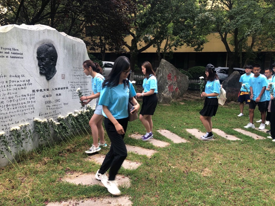 的发展历程及学校在教学、育人、科研、社会服务、基本建设、国际交流等方面取得的成绩。二组来到沈福彭教授石碑前,辅导员谭雪梅老师向同学们简单介绍了沈福彭教授的事迹及石碑上的文字。沈福彭教授“鞠躬尽瘁,死而不已”的精神感动和激励着无数青医人奋发向上、无私奉献,同学们也深受感染,全体同学向沈福彭教授鞠躬并敬献鲜花。
