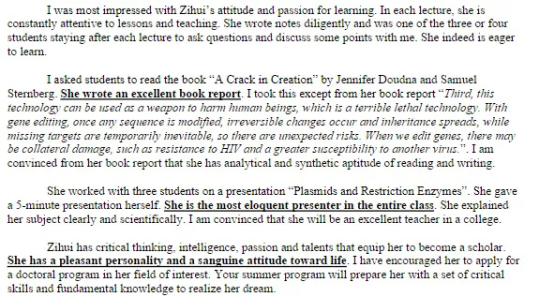 植物学的邱教授是这次美国之行中我最珍视的老师。他是一个对于教学和科研都毫不吝啬挥洒热情的科学家,也是一个和蔼可亲的长辈。最初他为我们极力推荐了一本书——“A Crack in Creation” ,并希望我们在结课时提交一份读书报告。值得一提的是,这本书的作者在今年获得了诺贝尔奖,因此,我对邱教授的敬佩又多了一分。在我递交读书报告以及结课汇报结束以后,他找到了我。在聊天过程中,邱教授不仅称赞了我的表达能力,并且关心我对未来的打算,还鼓励我追求更高的目标并坚持下去。那种包含着父辈的关怀和专业教授的指导像一双巨大的手掌支撑在我的背后,成为我前进的强大动力。在申请夏令营期间,邱教授欣然接受为我书写推荐信的请求。看到信后,我读着读着竟不知何时红了眼眶。