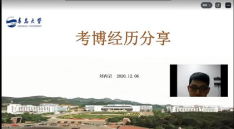 优秀学位论文等多个奖项。刘丙岩首先从自己考取复旦大学博士研究生失败的经历讲起,提醒同学们要多做准备工作,提取联系导师;全面参与科研活动,不要只专注于SCI论文。他和大家谈起自己成功通过山东大学博士研究生考试,正是得益于提前联系导师,与导师沟通交流比较多,同时自己的SCI论文发表比较早。他把自己的升学经验总结为三条:“首先最重要的是提前联系导师确定名额,确定导师意向;其次要尽早完成课题,尽早投稿,文章出的快就是优势;第三是不能“唯论文”论,要全方面发展自己。”