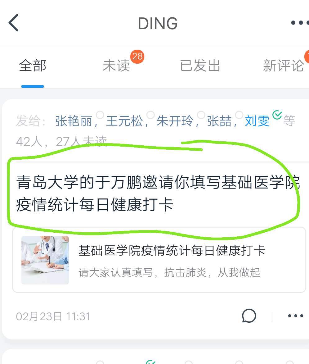 疫情统计每日健康打卡”任务(具体操作见附件)。每天上午12点前学院防控办会在钉钉里提醒未打卡人员一次。打卡规定时间未完成人员,学院防控办将通过学系(实验室)主任继续督促完成,并全院公布未打卡人员名单并统计人员未打卡次数。