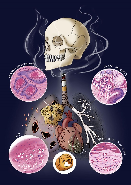 第二届形态学绘图大赛,选拔优秀作品参加全国“高等医学院校第二届大学生形态学绘图作品评选”。开始征稿以来,来自2019级、2020级、2021级临床医学、预防医学、药学、医学检验、口腔医学及医学影像等各专业的学生踊跃参加活动,源源不断的精彩作品,通过形态学创意手工绘图、机绘三维建模等方式呈现着医学形态结构的特点,体现着医学生的艺术与创意。从70份收集到的作品中,从科学性、规范性、综合性、创意性及应用性等多个层面进行综合评价,17副作品报送到全国“高等医学院校第二届大学生形态学绘图作品评选”。最终,王紫懿《烟渺渺兮肺心寒》、鲁逸名《高血压的“前因后果”》等两幅作品获得一等奖:代逸凡《视网膜万花筒》、孙玥 《生命起源》、刘小瑜《心·花败》、张晨彤《风湿性心脏病》、魏恺《风吹草地见包虫》等5副作品获得二等奖;田康祺《镜下的永恒之美》、杨佳欣《识“肺”》、王雨欣《生命的献花》、刘艳娜《病毒性肺炎》、韩培航《肝细胞癌的病理变化》、庞浩《要爱不要“艾”》等6副作品获得三等奖。