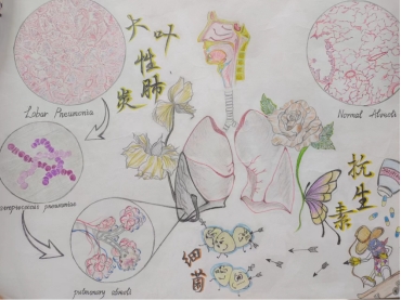 作品简介: 大叶性肺炎主要是由于机体抵抗力减弱,使得肺炎链球菌侵入肺泡而发病,且多发生于单侧肺下叶。作品描绘的是大叶性肺炎的灰色肝样变期,通过盛放和衰败的花朵来分别表示肺的健康与疾病,并在左右两侧附上病变肺泡与正常肺泡的显微结构,便于更加直观清晰的比较两者的差异。同时,下方运用拟人手法,告知大家在疾病早期运用抗生素治疗的必要性,希望由此引起大家对这类细菌性疾病的关注与重视,养成健康的生活方式,保护好自己的身体。
