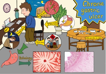 作品简介:慢性胃溃疡是一种常见的消化系统疾病,其最常见的症状为餐后胃部的烧灼性疼痛,发病原因主要为长期的幽门螺杆菌感染和非甾体类抗炎药物的过度使用,以及长期的精神紧张导致的植物神经紊乱,吸烟饮酒导致的胃黏膜抗消化能力下降、遗传等。按医嘱服药、改善生活方式、戒烟酒等措施对胃溃疡的治疗及愈后具有较好作用。保持良好的生活习惯可以预防胃溃疡的发生。让我们了解胃溃疡,打败胃溃疡,预防胃溃疡,一起拥抱美好“胃”来!