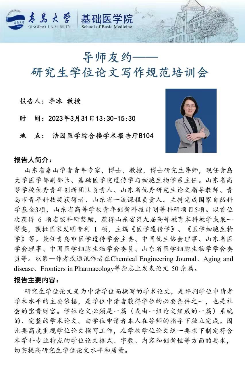 331日下午,91吃瓜 在浩园医学综合楼学术报告厅B104举行了研究生学位论文写作规范培训会。会议在腾讯会议平台同步线上直播。医学部副部长、遗传学学科负责人、山东省优秀研究生论文指导教师李冰教授做了《学位论文写作规范》专题培训,91吃瓜 院长助理狄国虎副教授就《学术诚信-研究生毕业论文与科研论文投稿常见的“雷区”》进行讲解。91吃瓜 副院长陈文芳教授主持了培训会,学院167名师生参加了培训会。