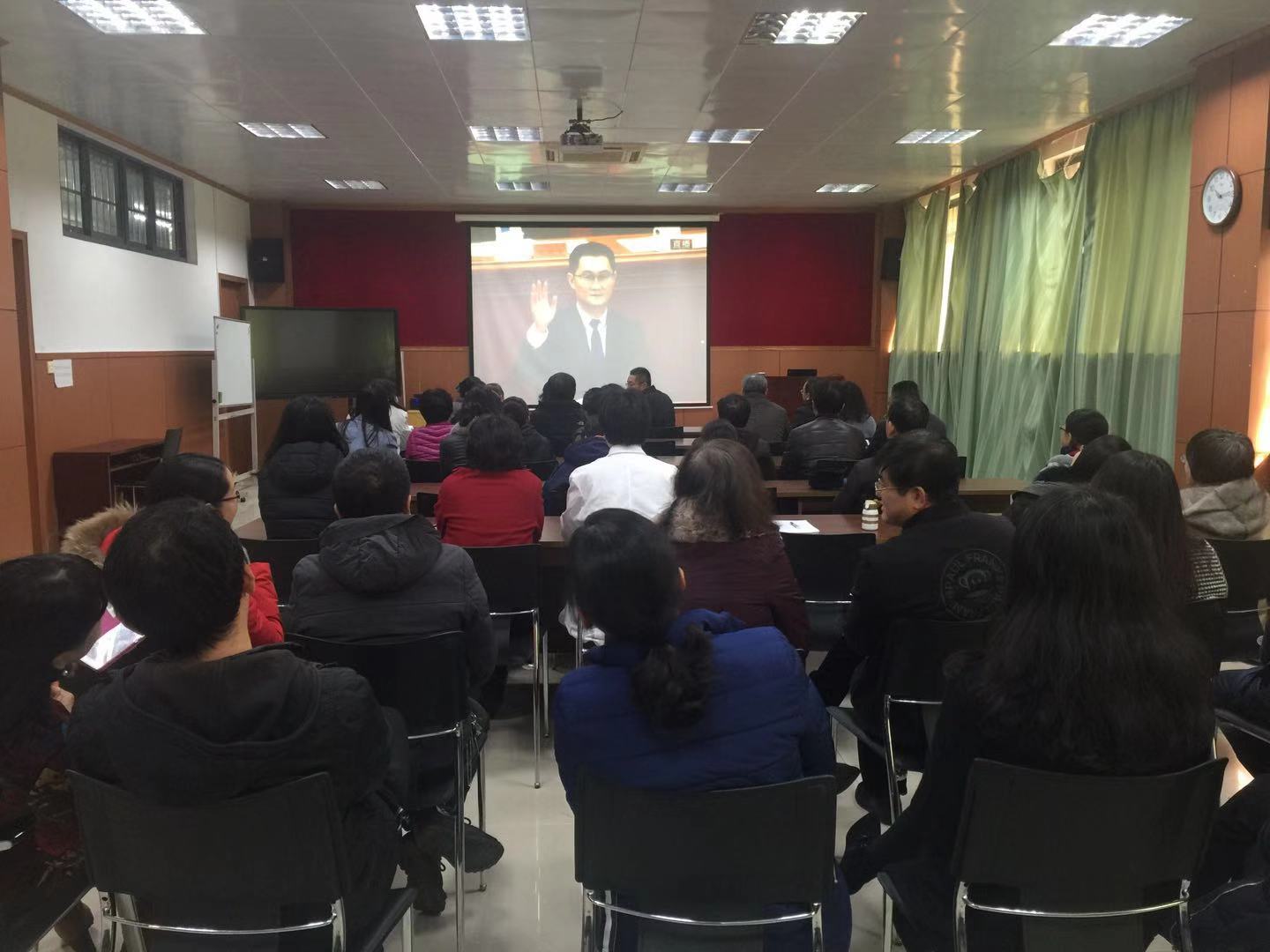 全体教师在博雅楼103会议室共同观看庆祝改革开放40周年大会直播盛况。
