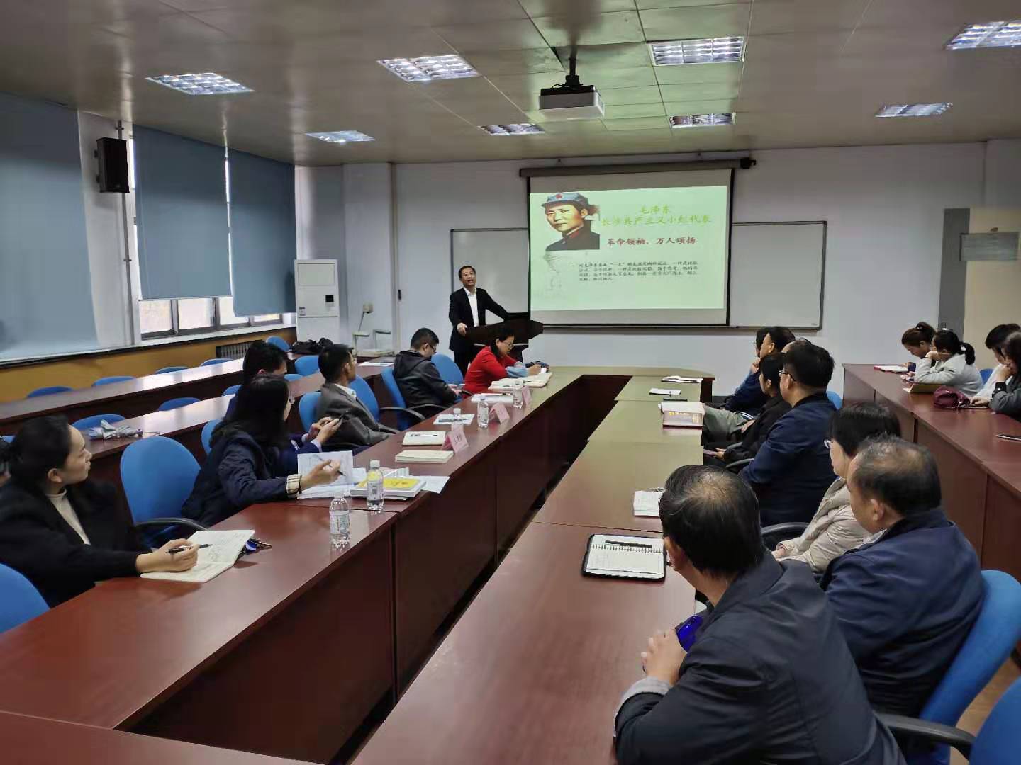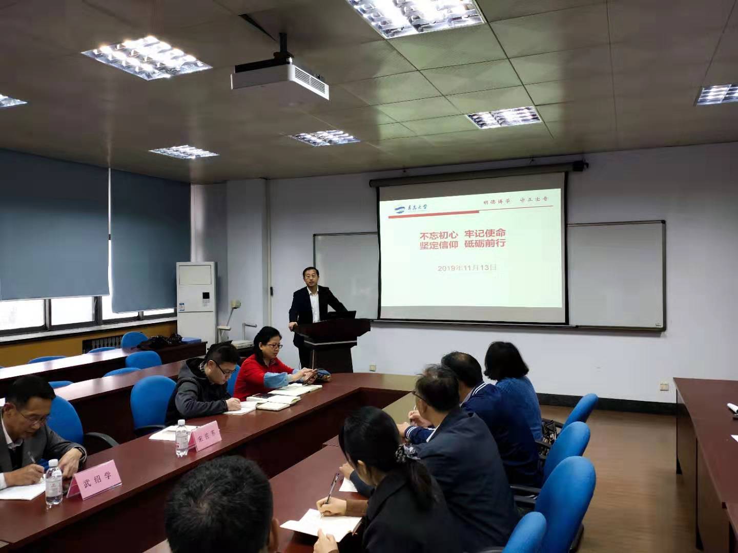 在博雅楼403会议室举行主题教育专题党课,学院党委书记宋佐东以《不忘初心、牢记使命,坚定信仰、砥砺前行》为题,为全院党员上了一场生动而深刻的专题党课。学校主题教育指导组成员、校党委组织员武绍学同志出席活动。党课由学院院长王建勋主持。