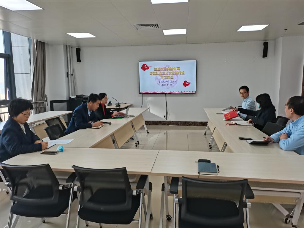 丛红群书记做了“推进文化自信自强,铸就社会主义文化新辉煌”学习体会的交流发言,丛书记强调了文化自信的重要性,提出“大道之行、天下为公;协和万邦、和衷共济”为主题的优秀传统文化传承理念,要继承和发扬中国优秀传统文化、革命文化和社会主义先进文化,提升共产党人以天下为己任,克己奉公、兼济天下的文化自信,促进社会主义文化繁荣。
