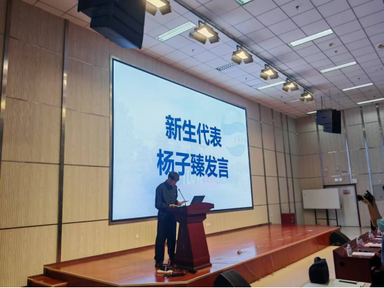 随后,新生代表杨子臻上台发言。他代表全体新生表达了对即将开始的研究生生活的期待与憧憬,并分享了自己选择医学作为终身事业的初衷与信念。杨子臻深情地表示:“我们将以更加专注的姿态投身于科研的浩瀚海洋,矢志不渝地在各自的研究领域内寻求突破与创新,秉持严谨求实的治学态度,以满腔的热情和不懈的努力,深耕细作于科研的每一寸土地。”路虽远行则将至,事虽难做则必成。"相信同学们在研究生阶段可以书写属于自己的精彩华章。
