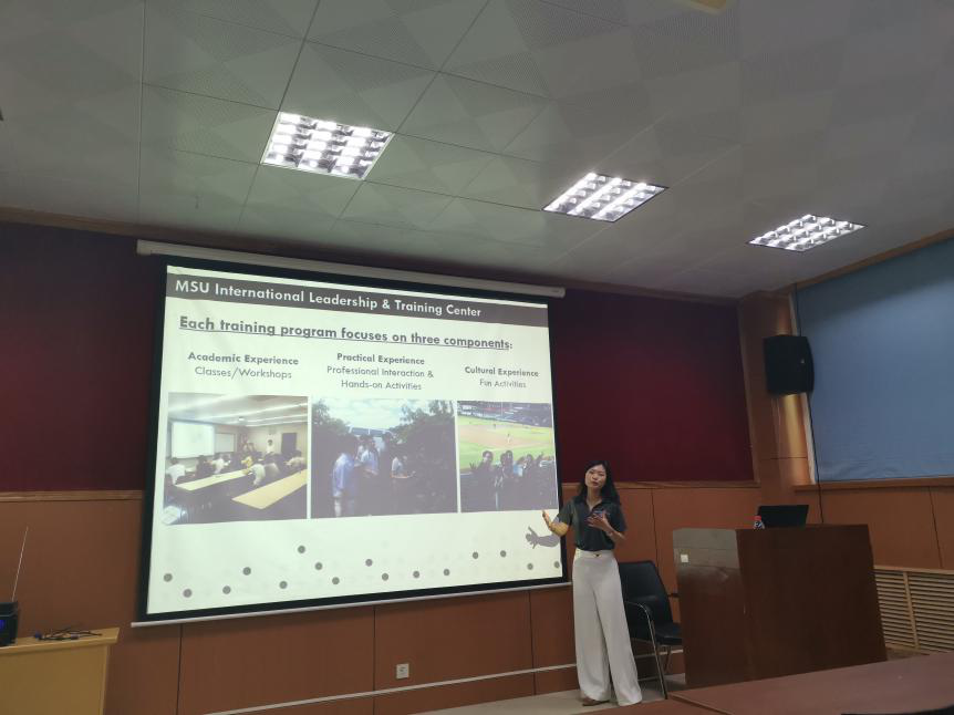 2017级华大基因创新班同学更深入了解美国密苏里州立大学情况,为出国学习做好充分准备,5月24日上午,学校国际处邀请美国密苏里州立大学(MSU)武艺、郑珍珍两位老师在博雅楼103室进行了专题讲座。