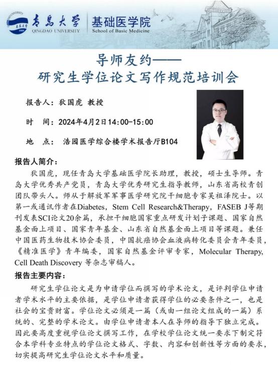 狄国虎教授结合国家、学校的相关文件以及自身指导经验,首先向同学们详细介绍了研究生学位论文的特点、基本要求、基本格式与撰写标准。依据往年学位论文的评审意见,围绕学位论文结构、实验设计、论文书写、图片和表格格式、结果表述、参考文献等评审专家提出的主要问题进行了详细阐述。