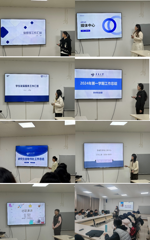 研究生会成功举办2024年度部门风采展暨年度总结表彰大会,旨在总结过去一年的活动经验,展望未来的工作方向,并表彰在年度工作中表现突出的部门。各部门依次上台,通过精美的PPT和生动的讲解,展示了过去一年举办的趣味运动会、宿舍文化节、研究生创新成果展、心语信箱等系列活动和取得的丰硕成果。同时,各部门也提出了下一年度的工作设想,展现了他们对未来工作的热情和信心。经过激烈的角逐,最终学生发展服务中心和媒体中心获评“2024年度先进工作部门”。李慧丽老师总结提到,研究生会成员之间需进一步强化合作,不断提升沟通协作的能力,以确保各部门之间能够紧密协同,形成强大的合力。她鼓励大家充分利用研究生会这一宝贵的工作平台,积极发挥学生干部的引领示范作用,从而在实践中全面提升自身的综合素质。