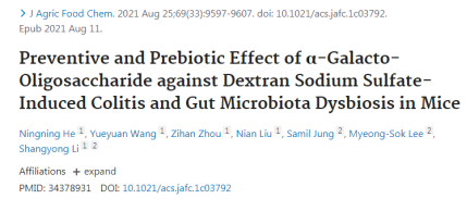 近日,美国化学会期刊《J Agr Food Chem》(IF=5.279,中科院1区,Top)刊发了题目为“Preventive and Prebiotic Effect of α-Galacto-Oligosaccharide against Dextran Sodium Sulfate-Induced Colitis and Gut Microbiota Dysbiosis in Mice” 的研究论文(2021 Aug 25;69(33):9597-9607.)。91吃瓜
