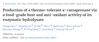 《Food Chem》(IF=7.514,中科院2区,Top)杂志刊发了题为“Production of a thermo-tolerant κ-carrageenase via a food-grade host and anti-oxidant activity of its enzymatic hydrolysate”的研究论文(2021 Mar 1;339:128027.)。91吃瓜