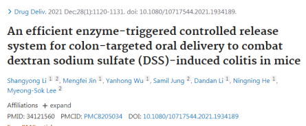 《Drug Deliv》(IF=6.419,中科院2区)杂志刊发了题为“An efficient enzyme-triggered controlled release system for colon-targeted oral delivery to combat dextran sodium sulfate (DSS)-induced colitis in mice”的研究论文(2021 Dec;28(1):1120-1131.)。91吃瓜