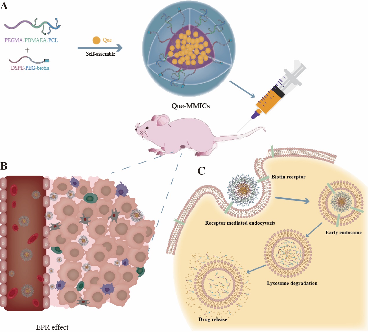 该团队成功地开发了生物素修饰的靶向递送槲皮素的纳米递药系统。该递药系统由两种结构相似的两亲性嵌段共聚物PEGMA-PDMAEA-PCL和DSPE-PEG-Biotin组装而成,可有效地靶向生物素受体阳性的A549细胞。该给药系统可以有效包封槲皮素并显著提高肿瘤细胞摄取效率,体内外均表现出优异的靶向肿瘤和抗肿瘤能力,这为其进一步发展成为一种有前途的给药系统铺平了道路。