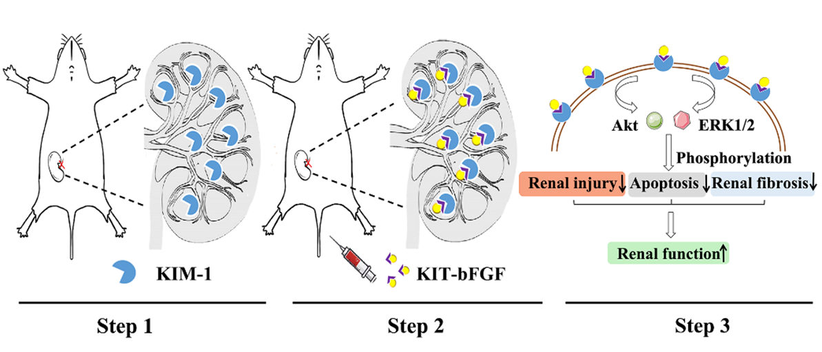急性肾缺血损伤严重威胁着人类健康。碱性成纤维生长因子(basic Fibroblast Growth Factor, bFGF)能够有效抑制肾小管细胞凋亡并改善肾脏功能。然而,目前bFGF的给药缺乏靶向性,难以在缺血肾脏组织中富集。文献报道当急性肾缺血发生后,肾损伤分子-1(Kidney injury molecular-1, KIM-1)显著上调,是早期急性肾损伤的重要标志物之一。以此为基础,经过基因工程技术设计构建了重组KIT-bFGF融合蛋白,该重组蛋白可特异性靶向结合于肾损伤后特异性上调的KIM-1,并延长bFGF其在缺血肾脏组织中的作用时间。当KIT-bFGF应用于急性肾缺血的治疗中,相比天然bFGF, KIT-bFGF能够有效抑制肾小管细胞凋亡、减轻缺血肾组织损伤、减少肾组织纤维化面积并且有效促进肾脏功能的恢复。该研究为bFGF靶向治疗的研究提供了全新的思路,也为急性肾缺血的治疗提供了一种具有临床应用潜能的新策略。