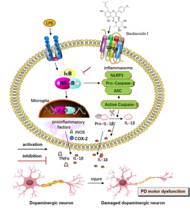 本研究应用小胶质细胞炎症模型和帕金森病(PD)小鼠炎症模型,结合药理学阻断、计算机分子对接及基因编辑技术,从G蛋白偶联雌激素受体(GPER)和细胞焦亡机制入手,阐明了宝藿苷I通过抑制NF-kB信号和NLRP3/ASC/Caspase-1通路的激活发挥神经保护作用,GPER可能是宝藿苷I的潜在作用靶点。本研究为发现PD新的干预靶点及获得抗PD先导化合物提供了重要理论和实验依据。