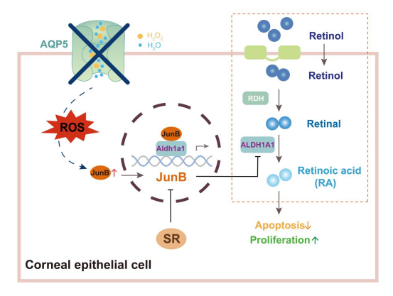 本研究发现在小鼠干眼模型的角膜上皮中,Aqp5和Aldh1a1表达水平均降低。 Aqp5敲除的(Aqp5-/-)小鼠角膜上皮中Aldh1a1表达显著降低,并出现干眼表型。结膜下注射RA可降低Aqp5-/-小鼠角膜上皮细胞凋亡,促进细胞增殖,改善干眼表型。mRNA测序、Western blotting、qRT-PCR和ChIP PCR结果显示,JunB在Aldh1a1启动子中的富集情况,并特异性调控Aldh1a1的表达水平。对干眼诱导的小鼠和Aqp5-/-小鼠结膜下注射SR(一种JunB的抑制剂)均可以改善小鼠干眼表型。