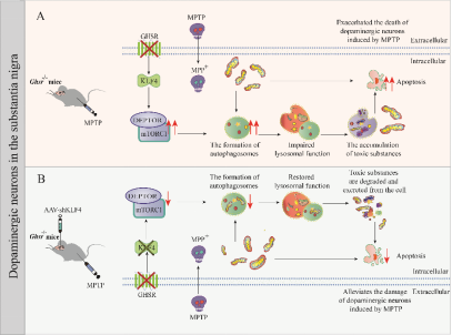 帕金森病是多发于中老年人的神经系统退行性疾病。本课题组前期研究发现,外源性给予ghrelin可通过激活生长激素促分泌素受体(GHSR)在帕金森病中发挥神经保护作用。在本研究中,我们观察到GHSR敲除后能够加剧MPTP诱导的帕金森病小鼠模型黑质多巴胺能神经元损伤。具体机制表现为GHSR敲除可增加KLF4的表达,进而转录调节mTORC1的DEPTOR亚基,导致自噬的持续激活和溶酶体功能障碍,从而抑制受损线粒体的清除。同时,敲低KLF4后可有效逆转上述过程,抑制黑质多巴胺能神经元损伤。本研究阐明了内源性GHSR在维持多巴胺能神经元功能中的重要作用,为帕金森病的治疗提供了新的靶点和实验依据。
