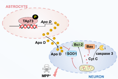 载脂蛋白D(ApoD)是一种分子量为29 kDa的糖蛋白,作为载脂蛋白家族成员之一,其在多种神经退行性疾病中发挥重要作用。相关研究表明,ApoD在帕金森病患者中脑多巴胺能神经元周围的神经胶质细胞中免疫染色增加。虽然先前的研究结果支持ApoD在神经保护中的作用,但其来源和对黑质区多巴胺能神经元变性的影响尚不清楚。本研究发现,在体内和体外帕金森病模型中,星形胶质细胞释放的ApoD水平增加。在原代中脑腹侧星形胶质细胞—神经元共培养体系中,星形胶质细胞所释放的ApoD可拮抗MPP+处理的神经元的神经毒性,具体机制表现在,星形胶质细胞中ApoD通过抗氧化应激和抗凋亡的能力来发挥对多巴胺能神经元的保护作用,增加的TAp73水平及其Tyr99磷酸化靶向调控ApoD的表达和分泌水平。此外,在MPTP处理的帕金森病模型小鼠中,条件性敲低星形胶质细胞TAp73可加重黑质区多巴胺能神经元的变性。本课题阐明了星形胶质细胞来源的ApoD对帕金森病模型中多巴胺能神经元的存活至关重要,这可能为帕金森病提供新的治疗靶点。