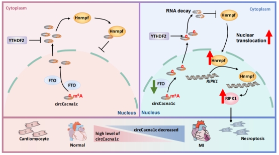 该研究发现在氧化应激心肌细胞和心肌损伤小鼠心脏中,环形RNA-circCacna1c的表达降低,circCacna1c的过表达抑制过氧化氢和心肌损伤诱导的心肌细胞程序性坏死,导致心肌梗死面积明显缩小,心功能改善。进一步探索其机制,结果显示circCacna1c直接与细胞质中的核不均一核糖核蛋白Hnrnpf相互作用,阻止其核易位并导致核内Hnrnpf水平降低,随后抑制Hnrnpf与RIPK1的结合与RIPK1表达。此外,FTO在程序性坏死过程中介导m6A修饰circCacna1c的去甲基化,并促进circCacna1c的降解。上述发现阐明了circCacna1c可以通过抑制Hnrnpf/RIPK1介导的心肌细胞程序性坏死来改善心肌梗死诱导的心脏损伤后的心功能,揭示了FTO/circCacna1c/Hnrnpf/RIPK1轴在减轻由缺血性损伤导致的心肌细胞程序性坏死方面展现出的巨大潜力,为心脏疾病的治疗开辟了新靶点。