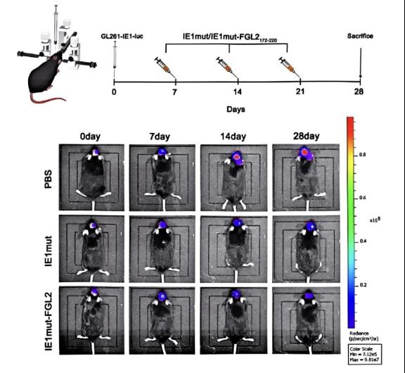 胶质母细胞瘤(GBM)是一种高度恶性的脑肿瘤,具有极强的侵袭性,预后差,患者生存率低。近年来,免疫疗法在多种恶性肿瘤治疗中展现了巨大的潜力,但在GBM中的应用效果依然有限。本研究创新性地利用生物信息学技术预测胶质瘤高表达蛋白FGL2的抗原优势表位,聚焦于FGL2172-220肽与人类巨细胞病毒即刻早期蛋白1突变疫苗(HCMV-IE1mut)的组合应用,利用机体的交叉提呈反应探索其在抑制GBM中的作用机制。研究结果表明,FGL2172-220肽能够显著减少胶 质瘤微环境中关键的免疫抑制细胞,如小胶质细胞、调节性T细胞(Tregs)和髓源性抑制细胞(MDSCs),增强CD8+T等细胞的浸润,从而增强HCMV-IE1mut的抗肿瘤效果,最终实现肿瘤体积的缩小并显著延长实验小鼠的生存期。研究成果不仅丰富了胶质母细胞瘤的免疫治疗策略,也为未来临床研究和治疗方案的设计提供了新的方向和启发。