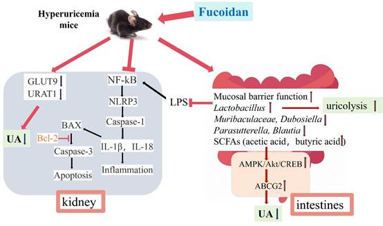本研究探讨岩藻多糖对高尿酸血症引起的肾损伤的保护作用。在小鼠模型中,岩藻多糖补充后,血清尿酸和肌酐水平降低,肾脏炎症标志物水平下降。岩藻多糖抑制了肾脏中炎症信号通路的表达,调节了抗凋亡蛋白的表达,并促进了尿酸排泄。此外,岩藻多糖通过维持肠道稳态,改善了肠道健康。研究表明岩藻多糖对高尿酸血症小鼠具有肾脏保护作用。它通过调节NF-κB/NLRP3通路和抑制炎症反应,改善肾脏损伤,并减轻细胞凋亡。岩藻多糖还抑制尿酸重吸收,保护肠道稳态,改善肠道屏障功能,调节菌群失衡,并增加短链脂肪酸水平,促进尿酸排泄。因此,岩藻多糖通过改善肾脏炎症、凋亡和肠道稳态,对抗肾脏损伤。这项研究支持了饮食对高尿酸血症的潜在益处。