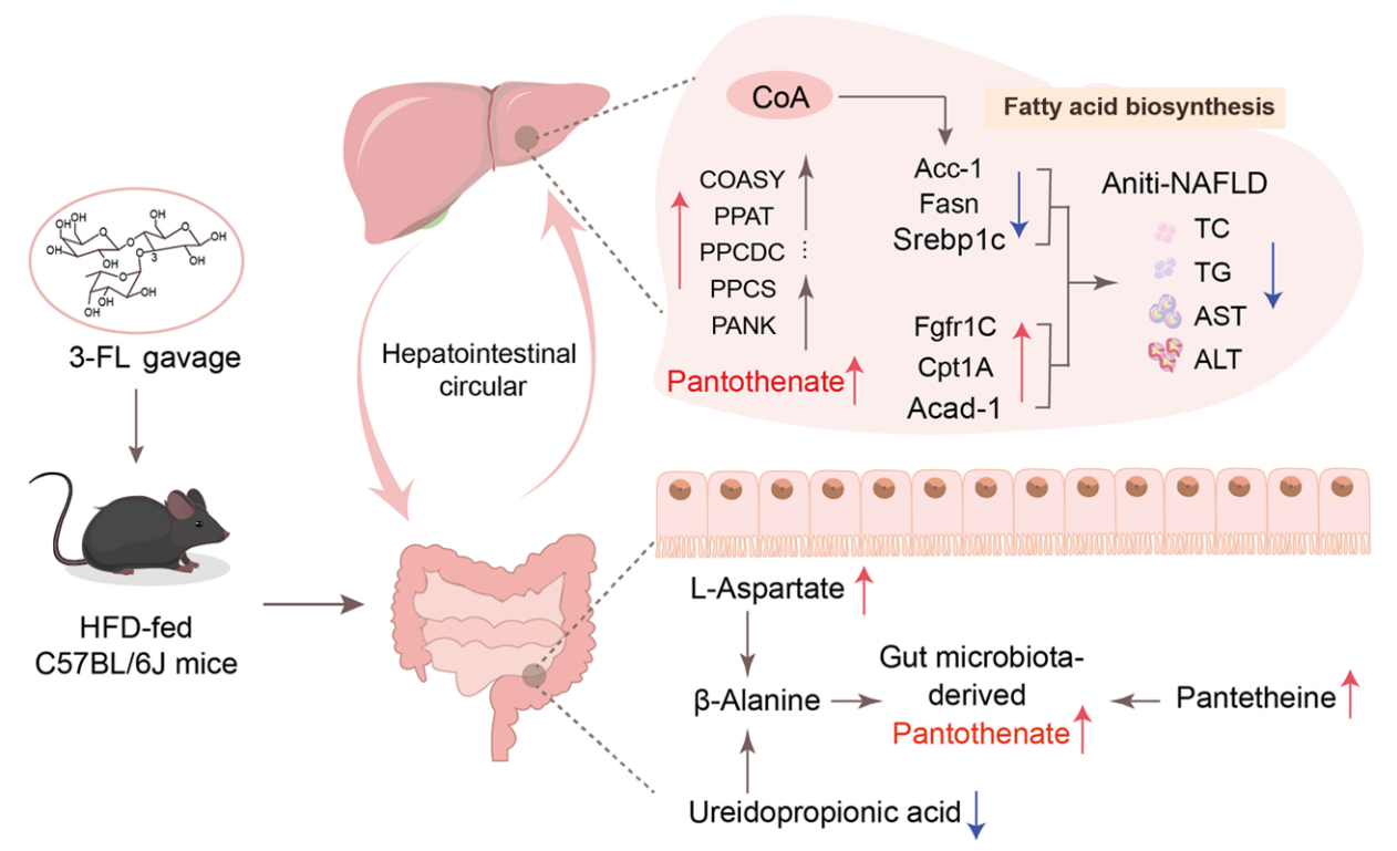 非酒精性脂肪肝(NAFLD)是全球日益严重的健康威胁。本文研究证明,3-岩藻糖基乳糖(3-FL),一种独特且重要的人乳低聚糖(HMOs),能显著减轻高脂饮食诱导的NAFLD小鼠模型的体重增加,改善肝脏脂质代谢,并减轻炎症,表明其作为预防和缓解NAFLD进展的膳食补充剂具有潜力。随后,粪便宏基因组和非靶向代谢组学联合分析显示,3-FL治疗显著缓解了HFD诱导的肠道菌群失调,特别是增强了泛酸代谢途径。靶向代谢物分析进一步揭示,肝脏和粪便中泛酸浓度显著增加,人群队列分析进一步显示血清泛酸水平与NAFLD的进展之间存在显著相关性,从而进一步证实泛酸有潜力作为NAFLD非侵入性诊断生物标志物。