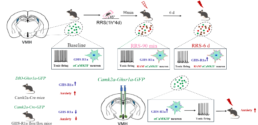 焦虑障碍是全球最常见的精神疾病之一,但其神经机制尚不明确。本研究首次明确了GHS-R1a(生长激素促分泌素受体1a)通过调控下丘脑腹内侧核(VMH)αCaMKII+神经元兴奋性参与焦虑行为的发展,提出了GHS-R1a作为治疗焦虑障碍潜在靶点的新概念。未来可基于这一机制开发针对性药物干预策略,尤其是在创伤后应激障碍(PTSD)等疾病中具有重要应用前景。
