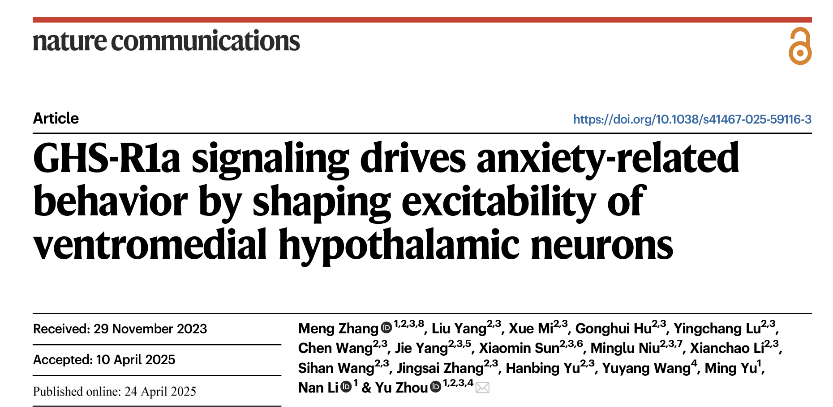 近日,我院生理学专业2020级博士研究生张萌以第一作者在Nature Communications(IF=14.7,中科院1区top)发表题为“GHS-R1a signaling drives anxiety-related behavior by shaping excitability of ventromedial hypothalamic neurons.”的研究论文,我院生理学专业2021级在读博士研究生杨柳和2017级硕士研究生弭雪也对本研究有重要贡献。91吃瓜