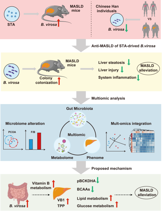 代谢功能障碍相关脂肪性肝病(MASLD)困扰全球约30%人群,可进展为肝纤维化、肝癌等重症,其发病与脂质代谢紊乱、肠道菌群失衡、硫胺素(维生素 B1)缺乏密切相关。研究发现,一株新型肠道丁酸单胞菌(B. virosa)可在结肠定植并高效合成硫胺素,经门静脉转运至肝脏后提升焦磷酸硫胺素及pBCKDHA活性,进而加速支链氨基酸降解,抑制高脂饮食小鼠的MASLD进展;进一步研究发现,在硫胺素缺乏饮食条件下补充该菌株也能显著提升肠道单磷酸硫胺素含量,缓解小鼠 MASLD 症状。